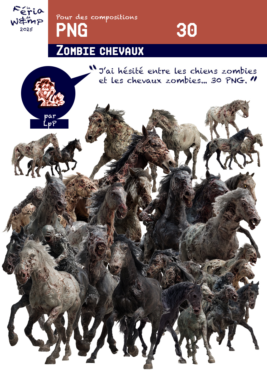Vous savez qu’on aime les zombies. Après les humains, les chevaux !30 PNG de quatre pattes ou de trois ! Cliquez sur l’image ou sur ce lien !