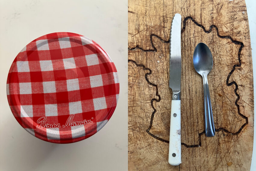 Pour cela, munissez vous d’un pot de confiture (j’ai choisi de la fraise). Un couteau et une cuillère.