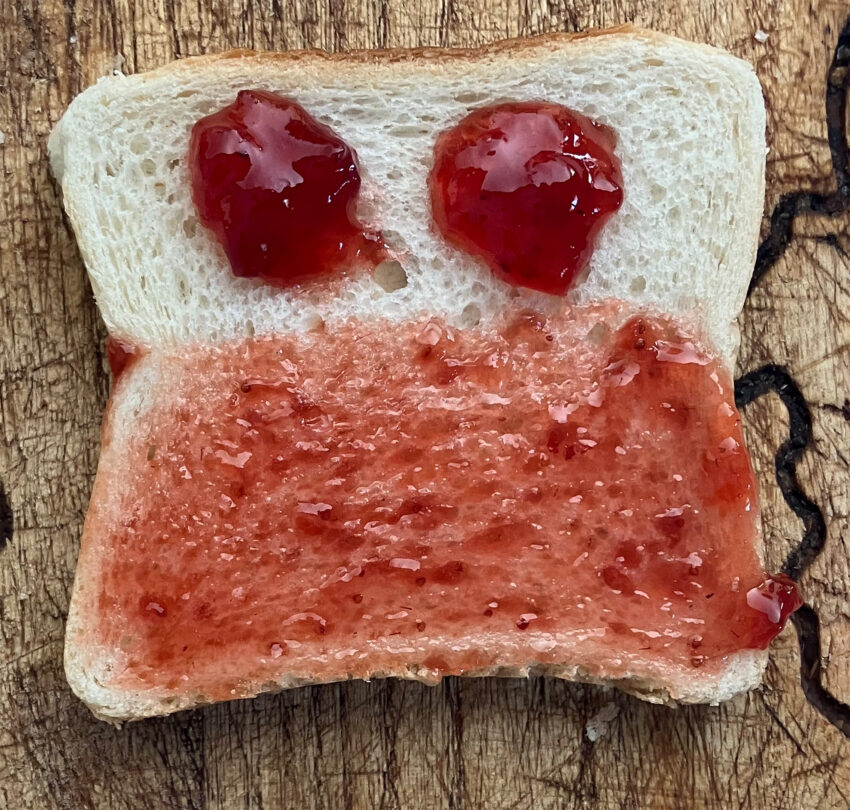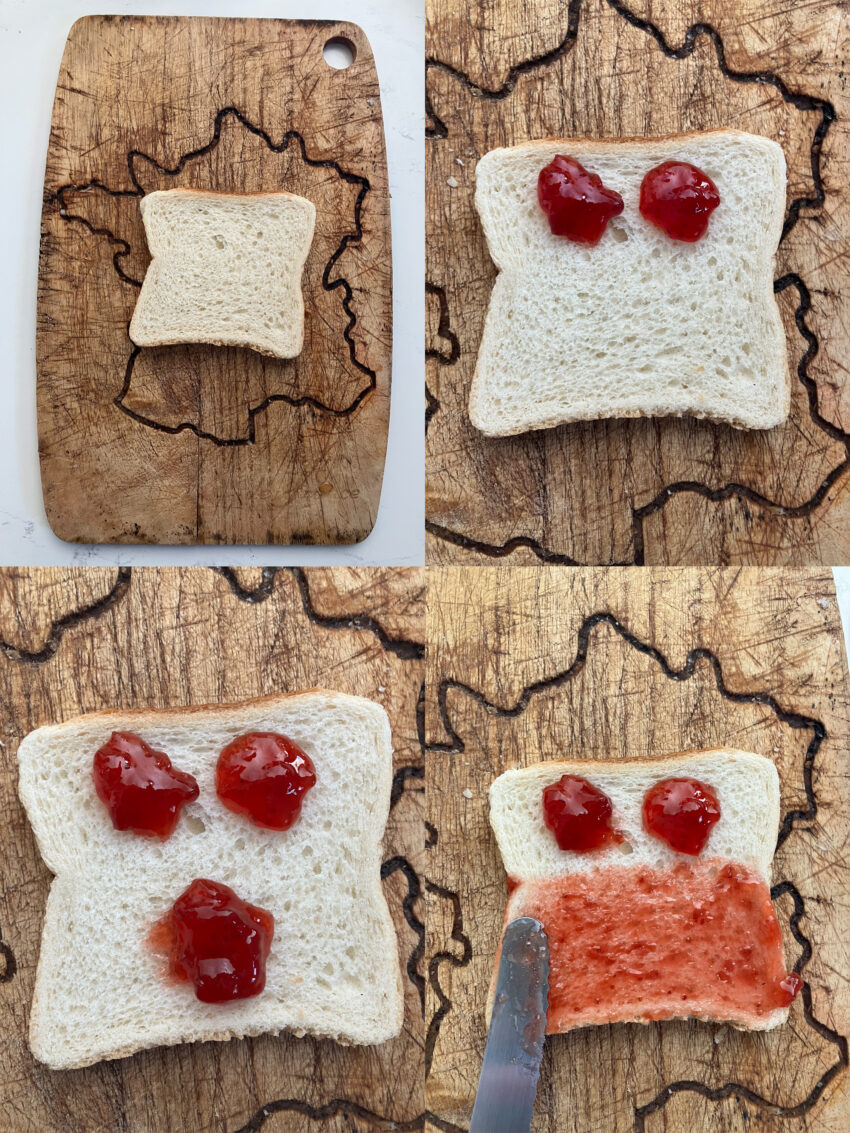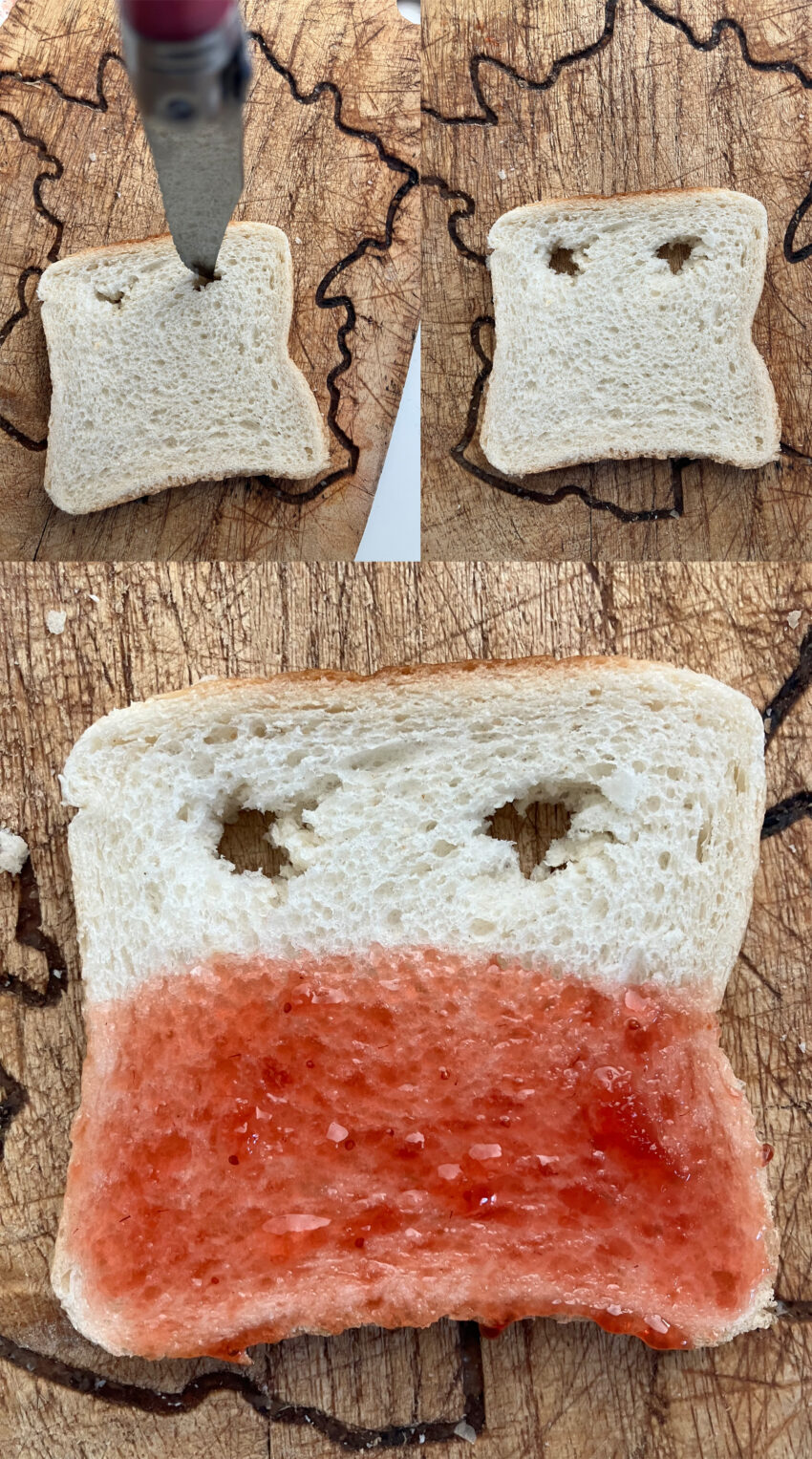 Facile et économe. Vous alliez ainsi intelligence et esthétisme pour cette tartine. Vous profitez pour manger la mie retirée des 2 trous. Vous économisez de la confiture et c’est bon pour la planète. Présentez votre tartine avec un discours progressiste et inclusif auprès de vos amis.